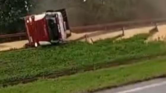 Uma carreta carregada com milho tombou na tarde desta quinta-feira (30.01) na BR-364, em Jaciara, a 142 km de Cuiabá. Motoristas que passavam no local registraram o momento.