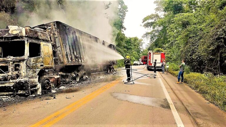 Uma carreta carregada de carne ficou completamente destruída por um incêndio na tarde de quarta-feira (09) na BR-174, em Comodoro (638 quilômetros a Oeste de Cuiabá).