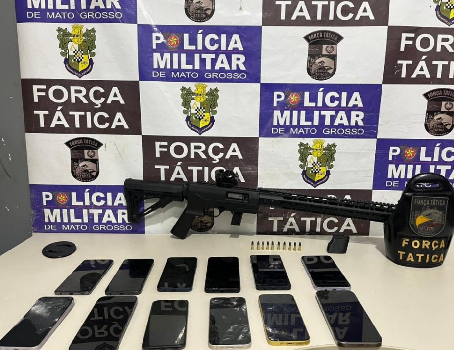 Durante buscas na residência, a equipe tática encontrou um rifle calibre .22 carregado com 10 munições, e durante busca no veículo, mais seis munições do mesmo calibre foram encontradas, além de diversos celulares.