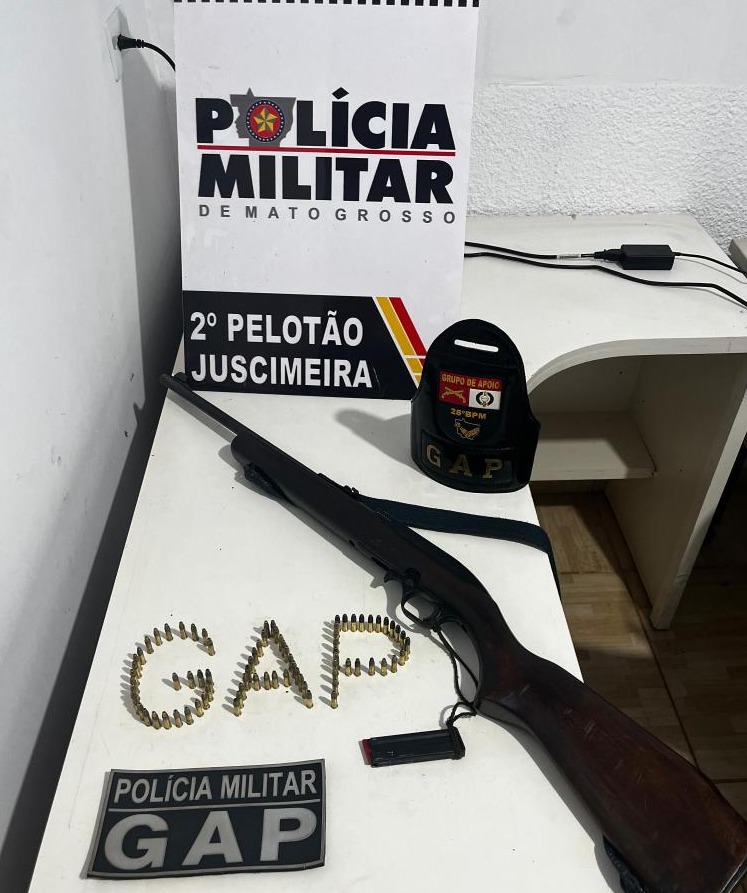 Homem é preso pela PM com espingarda municiada e mais de 70 munições em Juscimeira