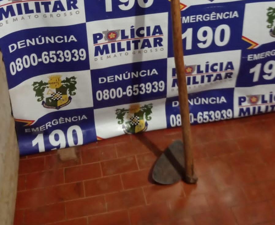 Policiais militares do 28º Batalhão prenderam, na noite desta quarta-feira (12.04), um homem de 23 anos, suspeito por lesão corporal contra uma mulher, de 48 anos, no bairro Ferreira Mendes, em Jaciara (147 km de Cuiabá). A vítima foi agredida na cabeça com golpe de enxada.
