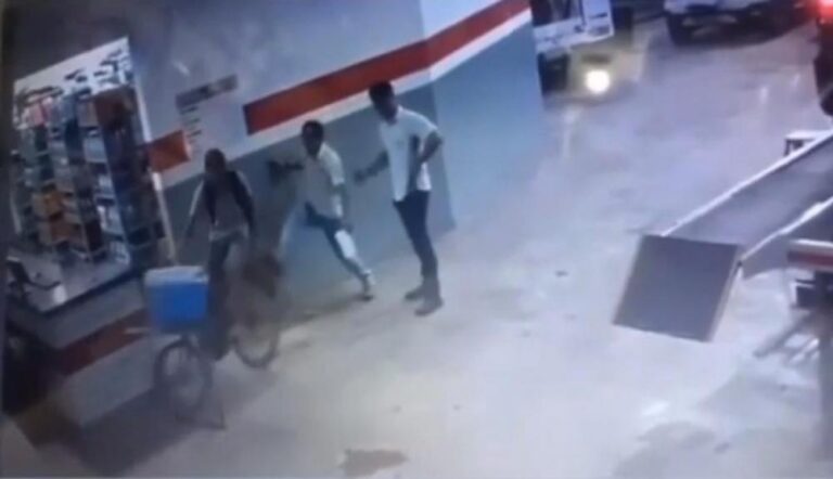 Nas imagens é possível ver que a vítima estava na porta de um comércio quando os dois indivíduos se aproximam dizem algo e um deles chuta o pneu traseiro da bicicleta que logo cai para o lado com o adolescente. O dono do estabelecimento percebe a situação e corre para ajudar o menino levantar enquanto a dupla sai para os fundos.