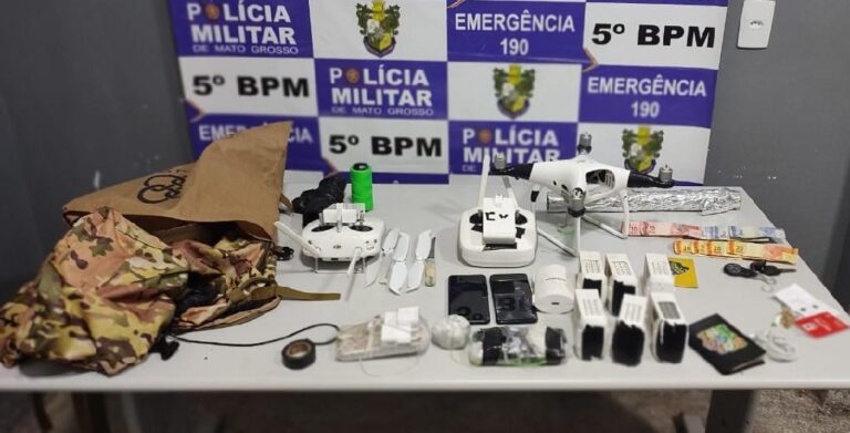 A bolsa foi localizada em uma região de mata, e em seu interior a PM encontrou um drone com quatro hélices, seis baterias de drone, dois controles, seis chips de celulares, uma faca, uma porção de maconha e diversos materiais utilizados para embalar o entorpecente.
