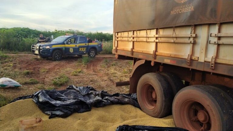 A Polícia Rodoviária Federal flagrou neste sábado (26), um grupo de quatro pessoas, nos limites da zona urbana de Rondonópolis realizando o furto de uma carga de soja e uma carreta bitrem Iveco/Stralis que estava escondida em meio a um matagal.